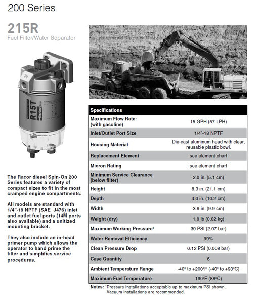 RacorStoreRACOR 215R2 Racors Marine Spin-on 200 Series fuel filter/water separators are available in three sizes to fit any engine compartment. All three ass...